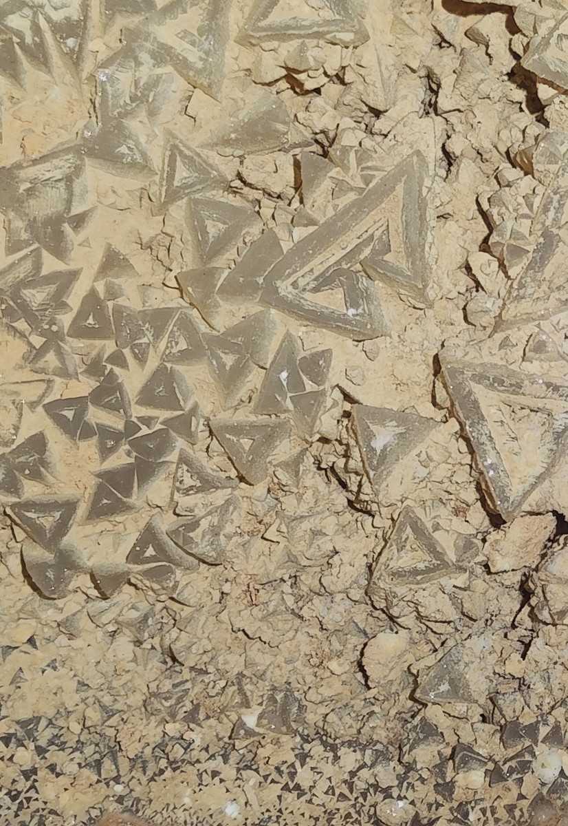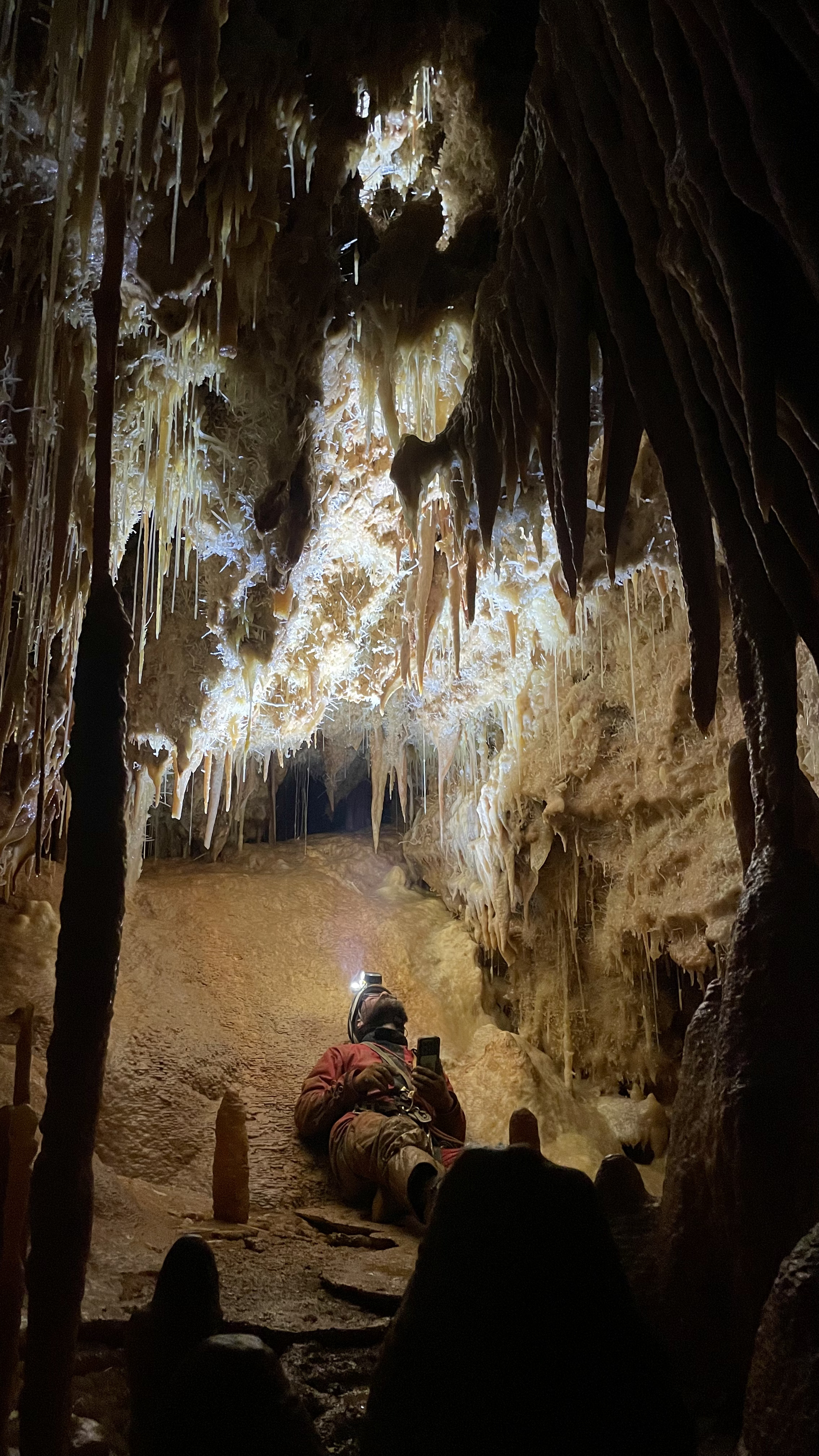 On prend le temps de manger tous ensemble avant de monter tout en haut, il est déjà 14h. On passe au moins 2 heures et demie là-haut à contempler les merveilles cristallines. Partout où nos regards se posent, c'est incroyable. La nature ici, a mis le paquet, on en prend plein les yeux : myriades de filaments d’aragonite tapissant les parois et toutes sortes de spéléothèmes, buissons d’excentriques aux arabesques improbables (on a retrouvé le jumeau rebelle du « 5 » de l’Aven Armédia), longues et fragiles fistuleuses joignant parfois le plancher, draperies rubanés, gours cristallisoirs couverts d’un manteau de pointes de calcite... Ces structures cristallines et scintillantes détonnent aussi par leurs variations et contrastes de couleurs : incolore translucide, blanc immaculé plus ou moins opaque, jaune paille vif, brun-clair chaleureux... Elles sont si délicates qu’on avance à pas de velours entre ces espaces concrétionnés de tous côtés, précautionneusement, ne rien toucher, ne rien faire vibrer. À regret, nous décidons de faire demi-tour.