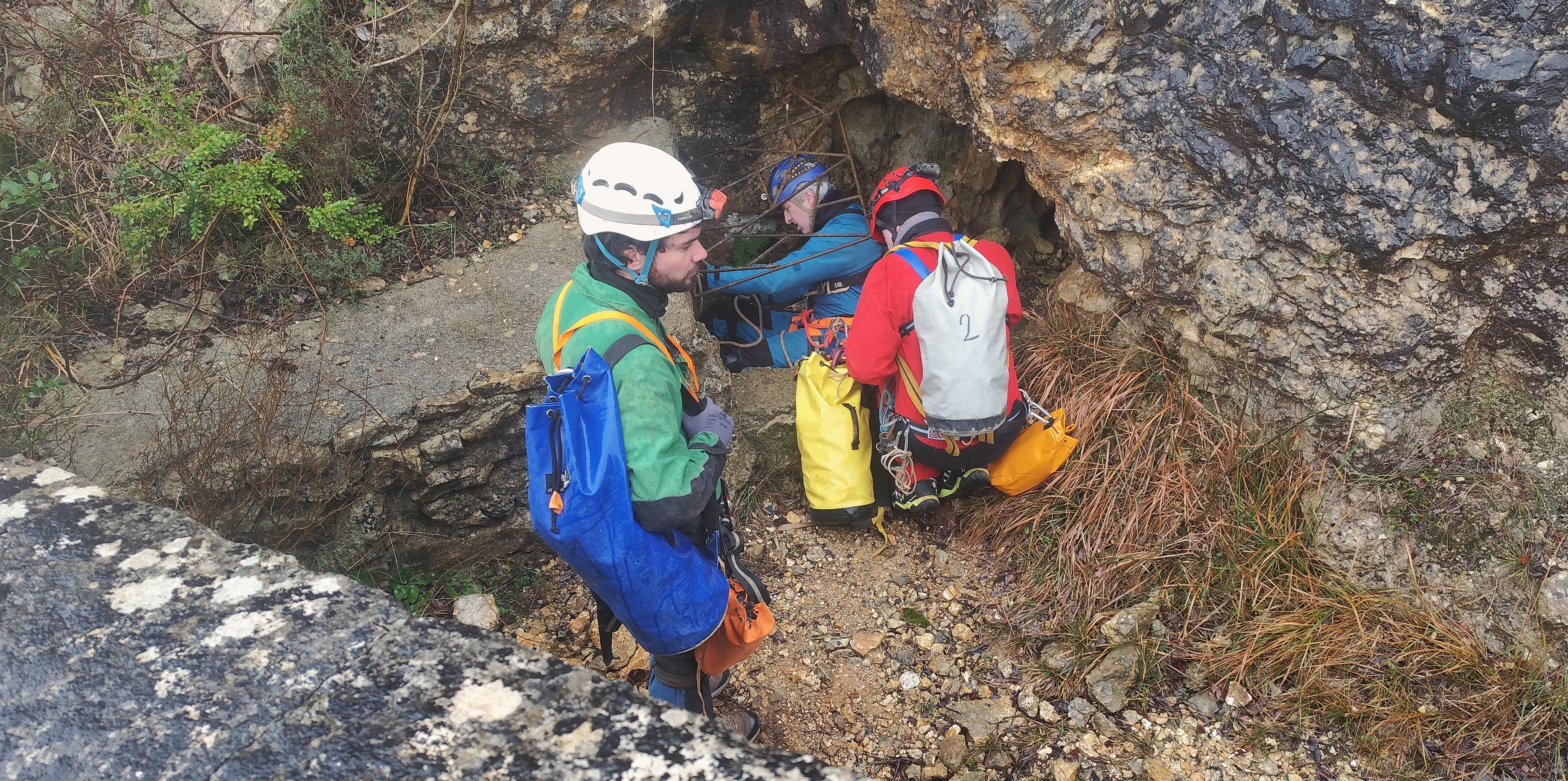 Début de la descente vers 10h30. David part en tête, Xavier fignole l’équipement derrière lui. Premier passage étroit avant d'arriver au P18, puis dans la « Salle Vincent Badaboum » la petite chatière avec sa petite flaque d'eau bien placée et enfin, le fameux « Trou qui siffle ». Alors bien regarder avant de s'y immiscer, travers par la gauche, regroupement, travers par la droite, plat ventre. Ça bloque, ça passe, ça frotte, ça coince, et hop ça sort. Un qui tire le kit, l'autre qui pousse. Ça avance bien, on se retrouve dans la « Grande salle ». Je trouve la petite spatule pour décrotter les chaussures avant d'attaquer la monté du P54 vers le réseau supérieur. La corde est bien grasse, et Xavier voit un nœud 3 ou 4 mètres avant le fractio. Arrivé au niveau du nœud, la corde est bien usée et le nœud papillon isole une tonche sévère (on dira plus tard « très mauvaise tronche cette vilaine tonche » !). Xavier passe au-dessus délicatement et préviens les copains de ne pas faire le yoyo sur cette corde. Antoine commence quant à lui, à équiper la main courante vers la « Salle du Chat », suivi par Vincent qui prend le temps d’ajuster une section par l’ajout d’un nœud papillon. Montant en suite de Xavier, David prend le temps de doubler le nœud d'isolation et au final de refaire le fractionnement sans passage de nœud, mais aussi de doubler ce premier tronçon de puits avec la C27.
