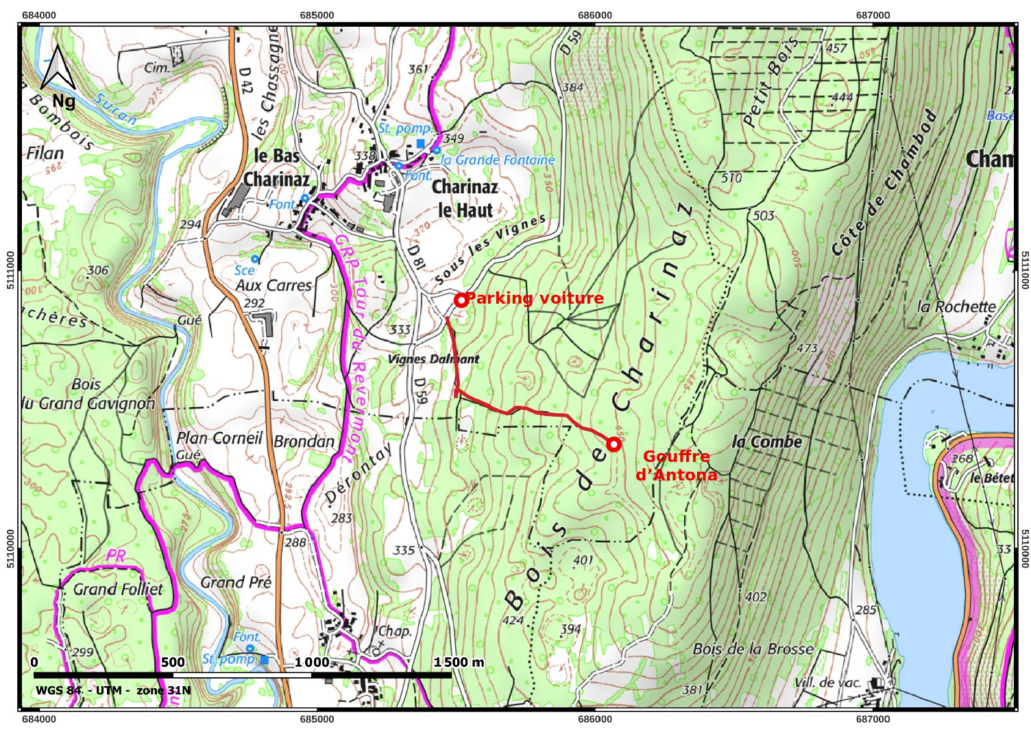Point de stationnement (WGS84) : Longitude Est 46,1265° Latitude Nord 5,4014°