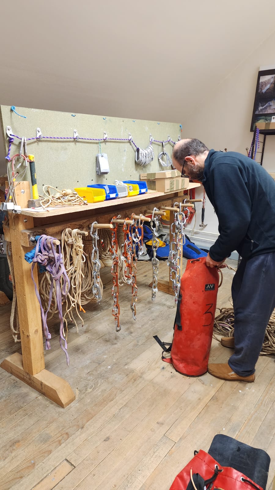 Arrivés au local samedi matin, on prépare — dans un élan de motivation fulgurante — les trois kits de cordes, mousquetons, dyneema, etc. Certaines longueurs de corde du club n’étant plus d’usage, le matériel sélectionné diffère de celui initialement programmé sur les fiches d’équipement. On choisit donc avec quelques tergiversations les longueurs de corde disponibles en fonction des besoins. Finalement seul bémol : les cordes sont sèches, elles seront plus difficiles à nouer et il faudra modérer la vitesse de descente pour éviter les échauffements.