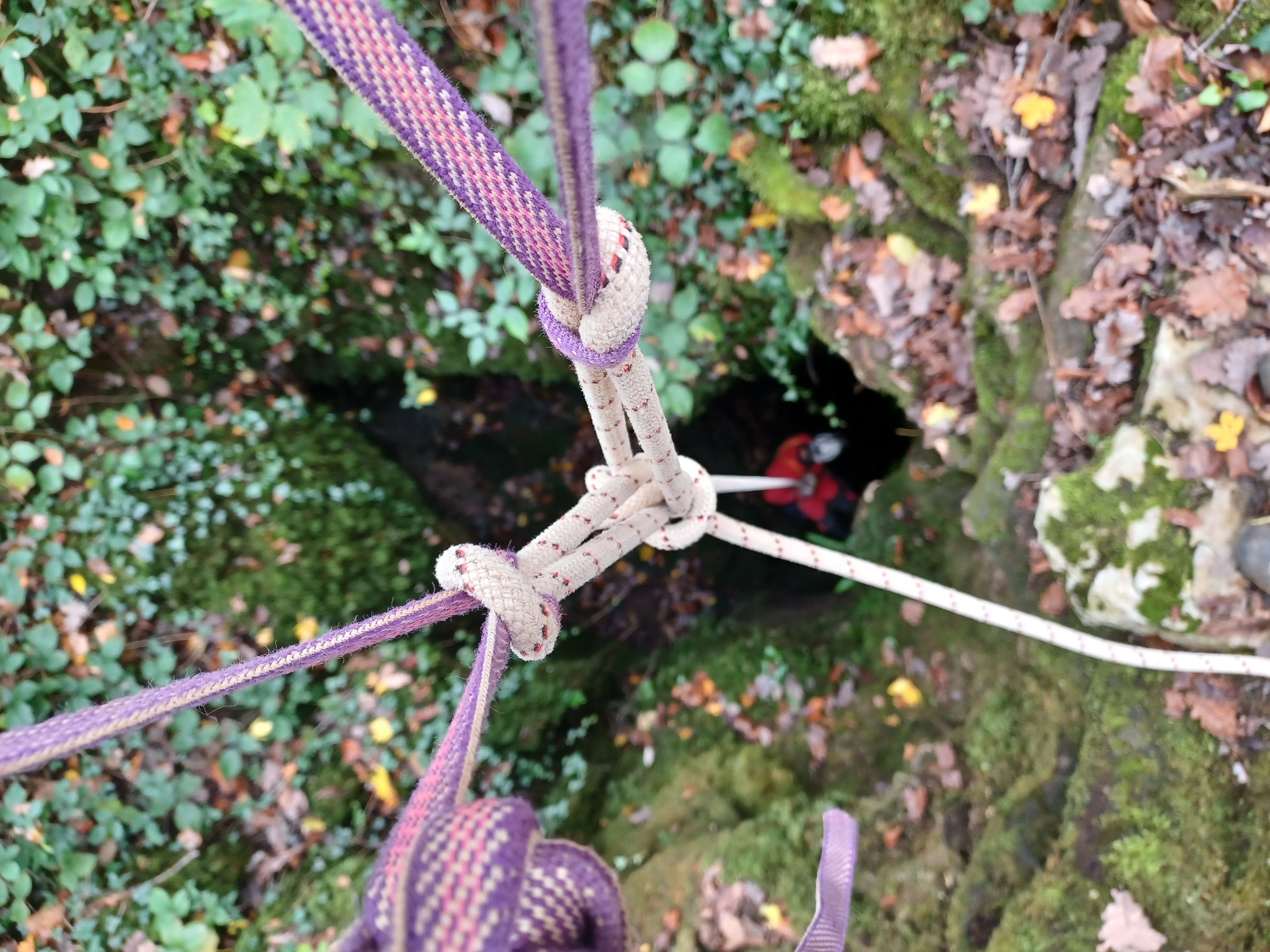 Le cas de cet équipement sur des arbres ne s’étant jamais présenté lors des entrainements en salle d’escalade, Vincent reste perplexe, mais Xavier le guide dans cet exercice finalement relativement simple. Avant de se pencher sur le puits d’entrée, Vincent commence par un nœud de cabestan sur un arbre vigoureux à l’écart du vide, puis assuré sur cet amarrage robuste, Xavier montre la démarche à suivre. Au-dessus du puits d’entrée, Vincent réalise donc, avec l’aide de Xavier, un nœud de chaise double maintenu par deux sangles enroulées autour de l’arbre penché. Le raccordement entre les sangles et le nœud de chaise double se fait par l’intermédiaire de simples « têtes d’alouettes ».