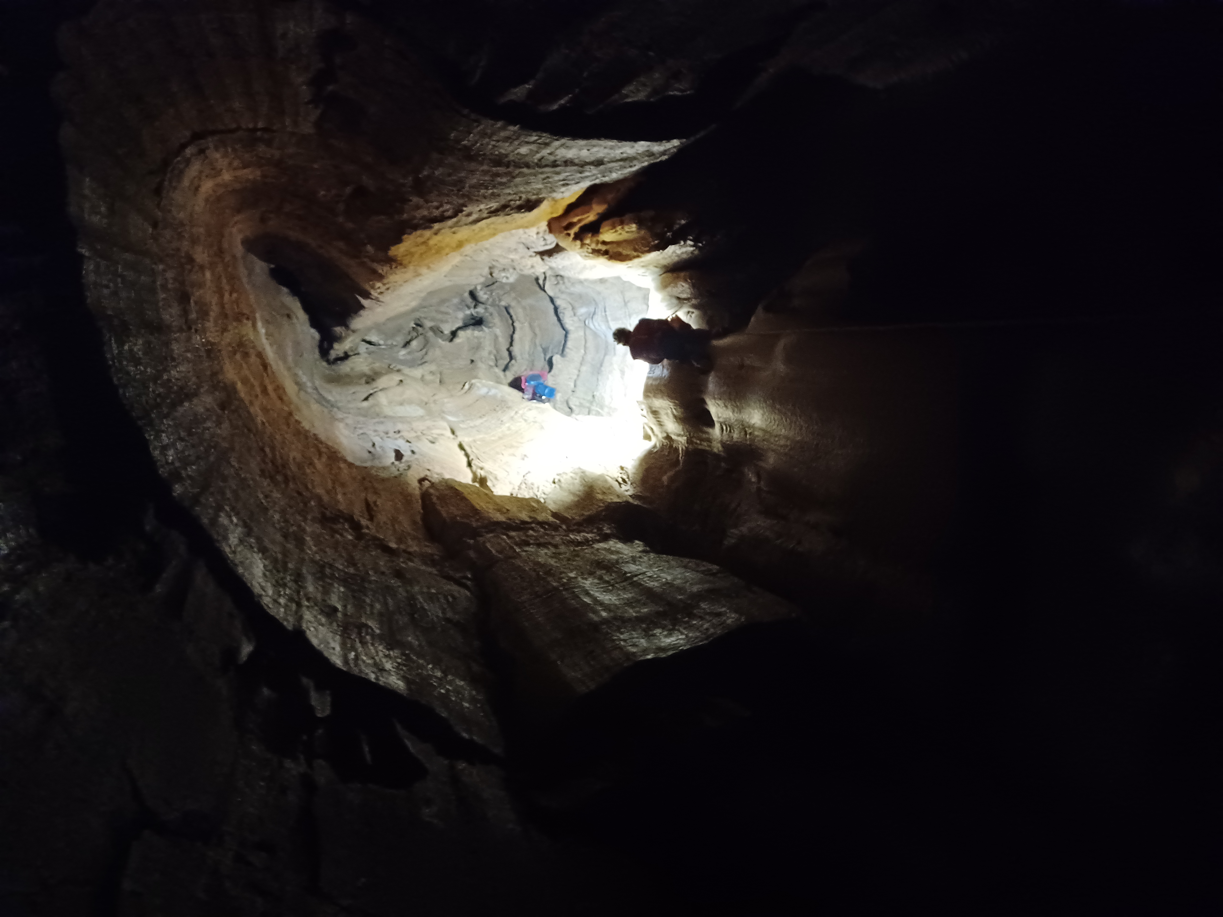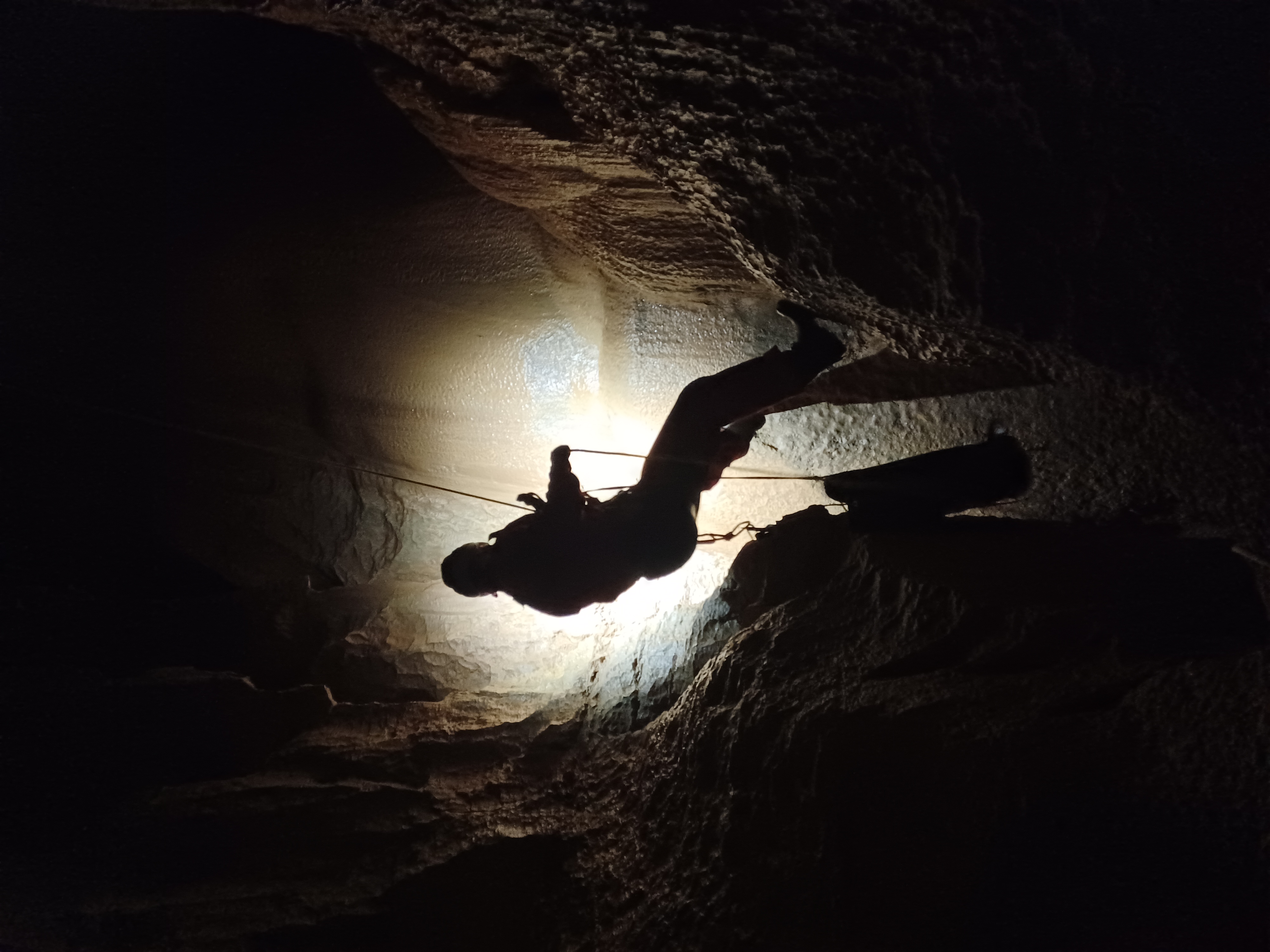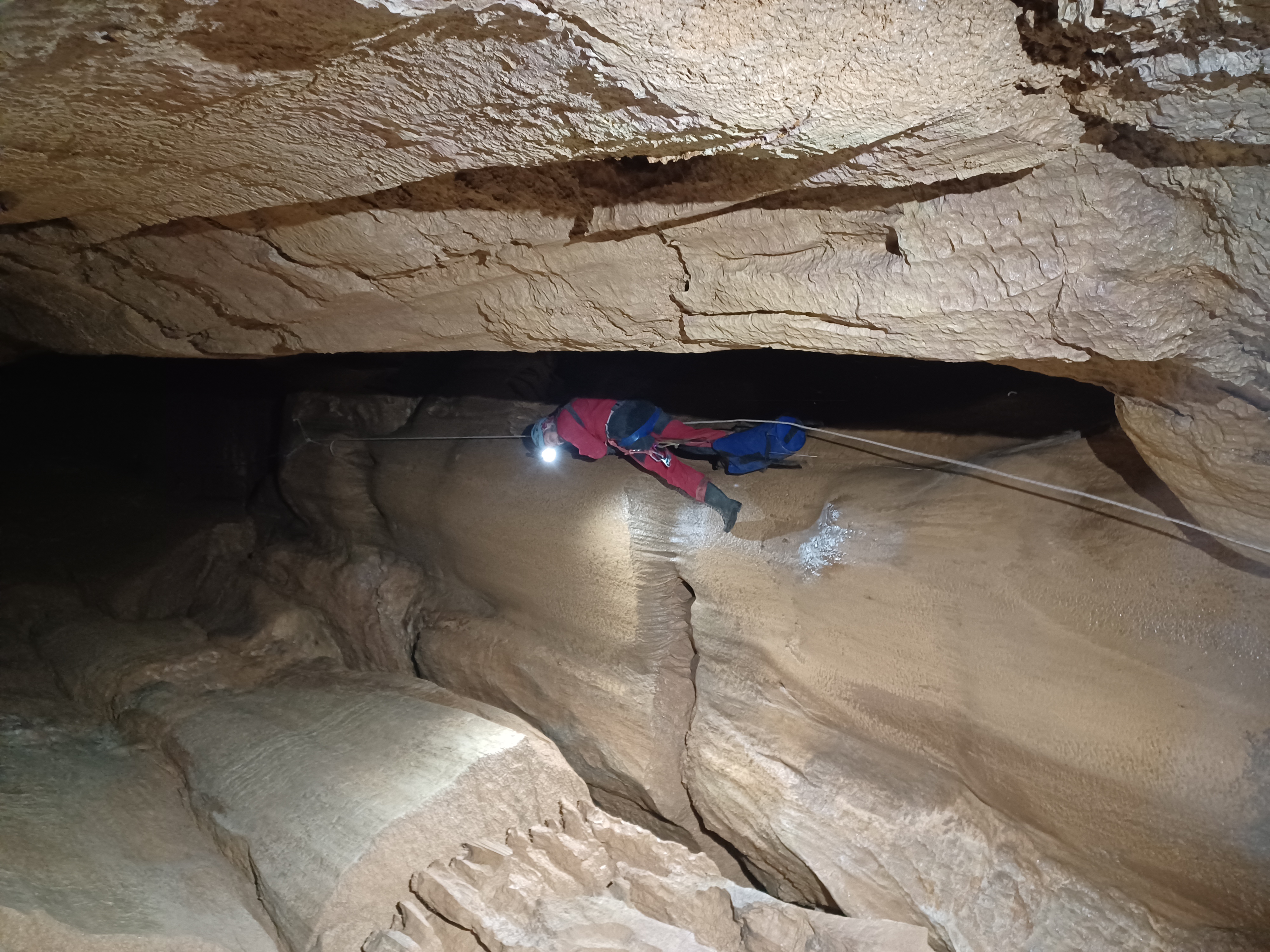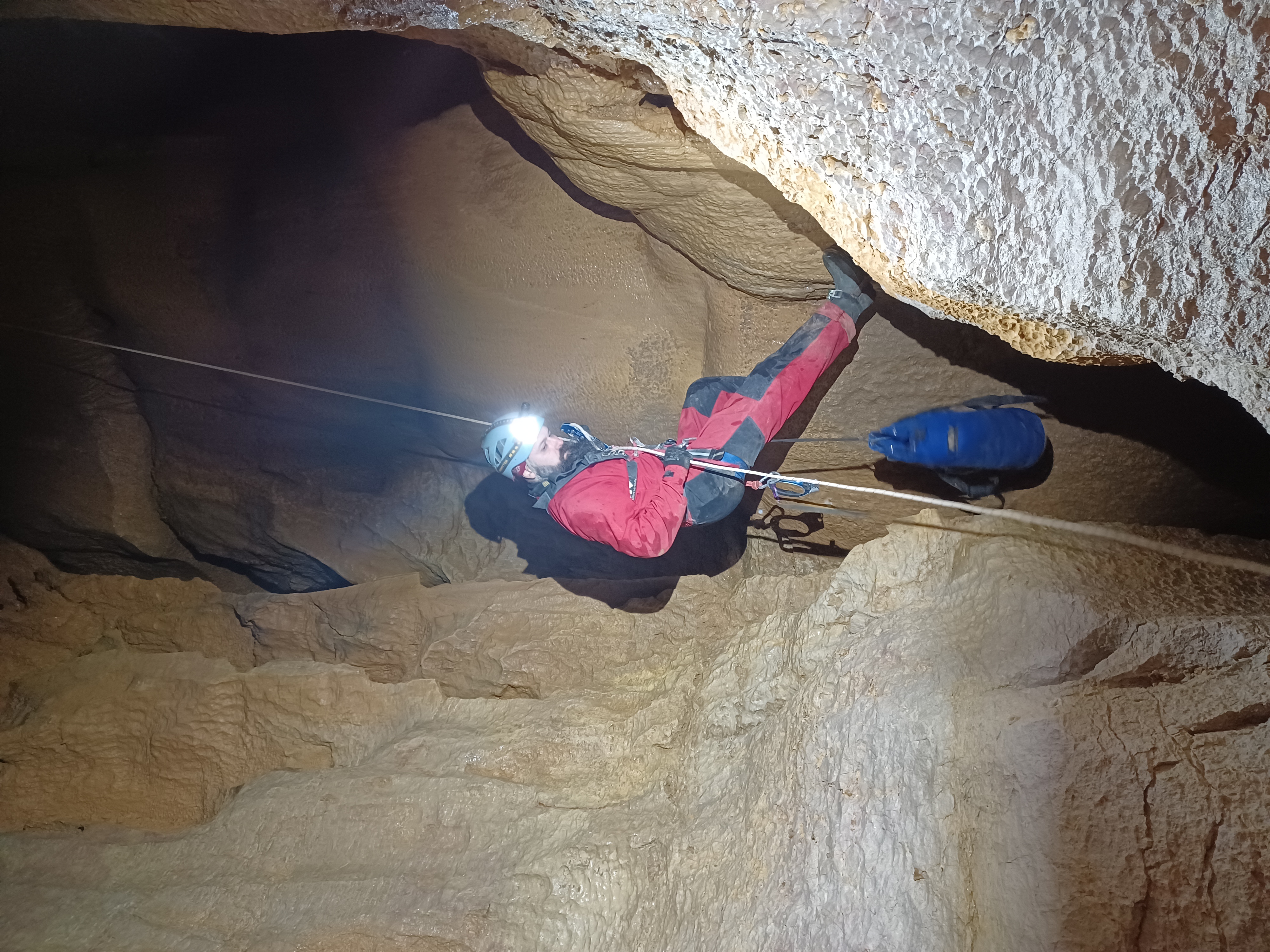 34 mètres de descente pour commencer, histoire de se mettre dans le bain (sans eau, heureusement). Ensuite une petite escalade de 9 mètres déjà équipée (corde fixe) pour atteindre un second puits de 28 mètres. Au bas de ce deuxième puits, on s’arrête devant une lucarne dont l’équipement n’est pas évident. Monsieur Caillou ouvre la voie, tête la première dans le vide. Logique.