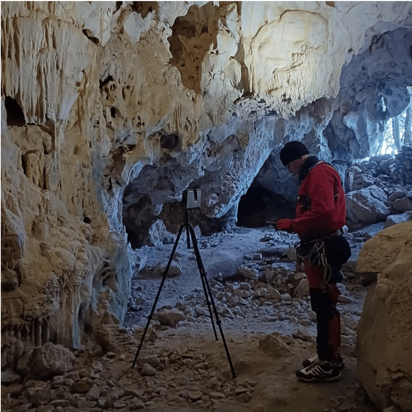 Arrivé dans la grotte, on forme deux groupes : ceux qui vont aider aux prises de vues 3D, ceux qui vont équiper la suite. Donc là aussi, chacun s’organise et repart vers ses objectifs.