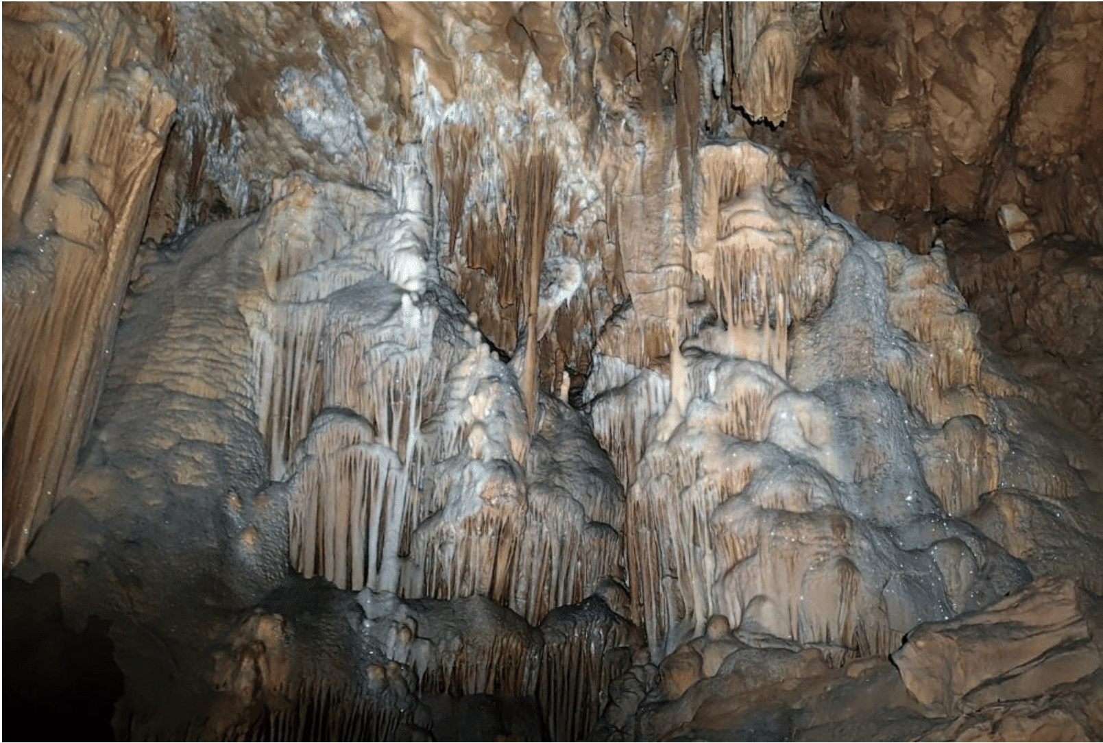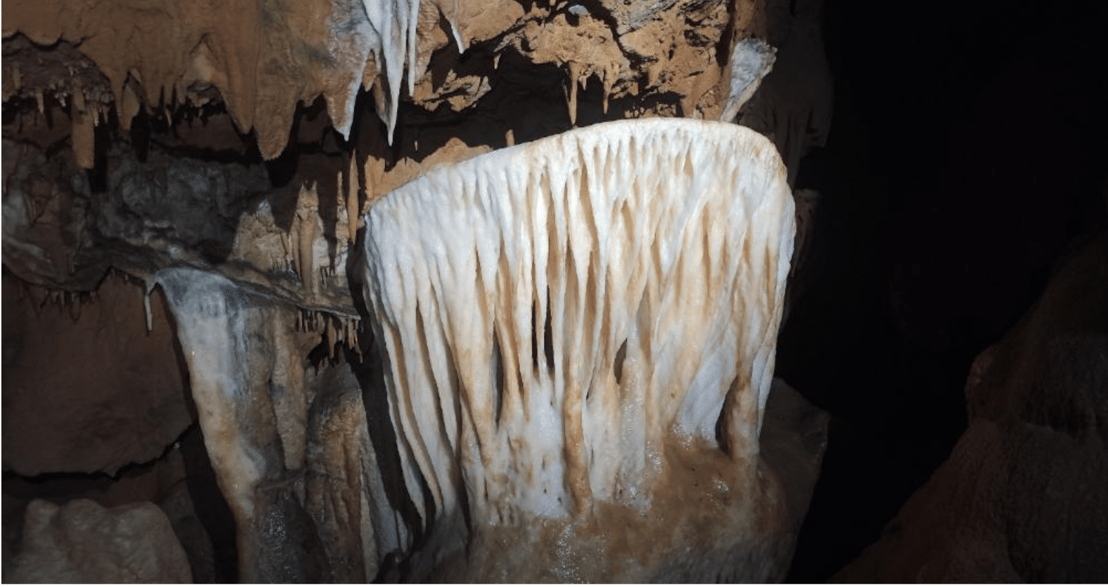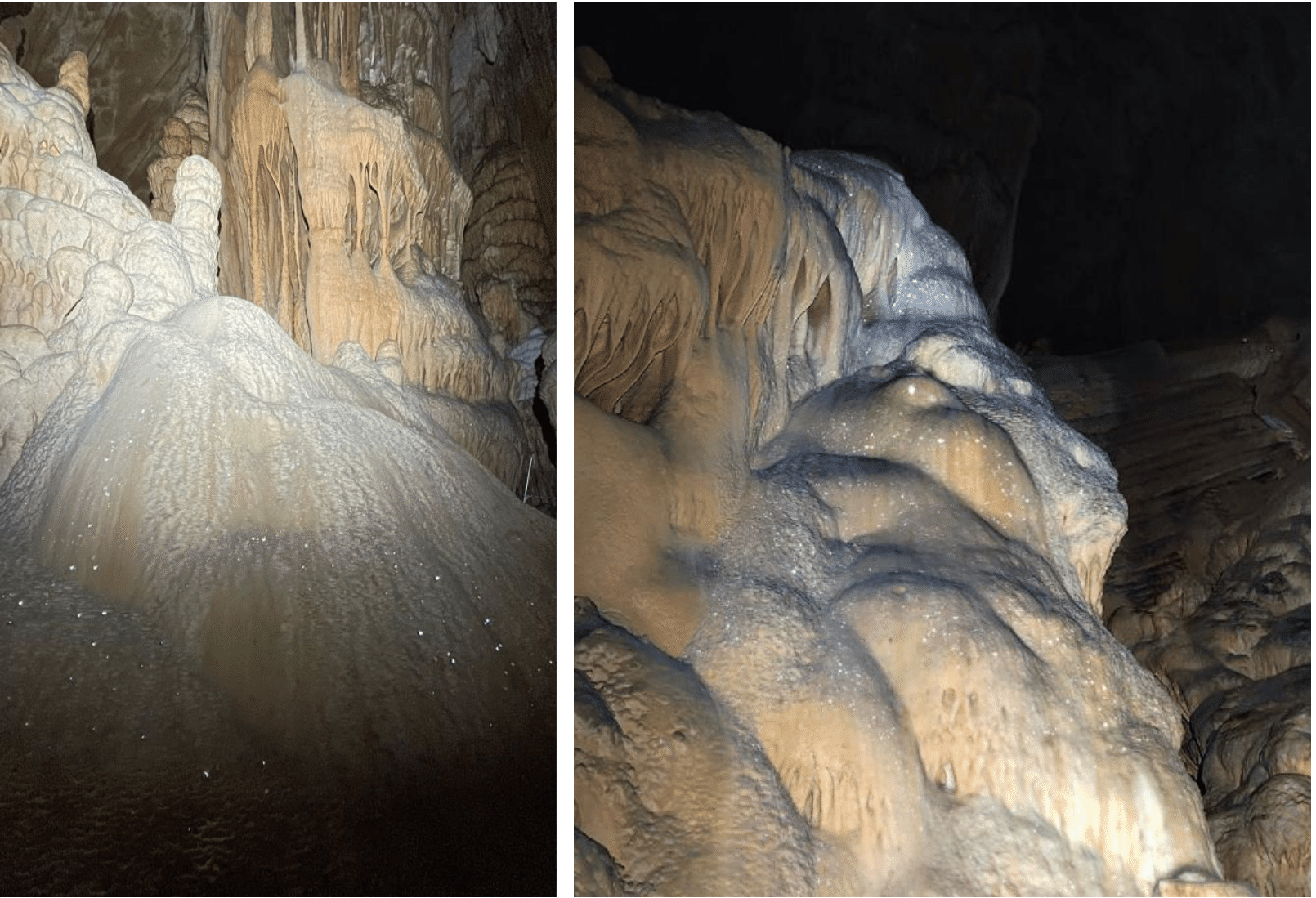 Dans la « Salle Blanche » notre groupe observe avec ravissement le scintillement des coulées stalagmitiques blanches. Au hasard des coïncidences angulaires, les plans internes de milliers de cristaux de carbonate de calcium (CaCO3 ; aragonite ou calcite ?) réfléchissent de-ci de-là nos faisceaux lumineux.