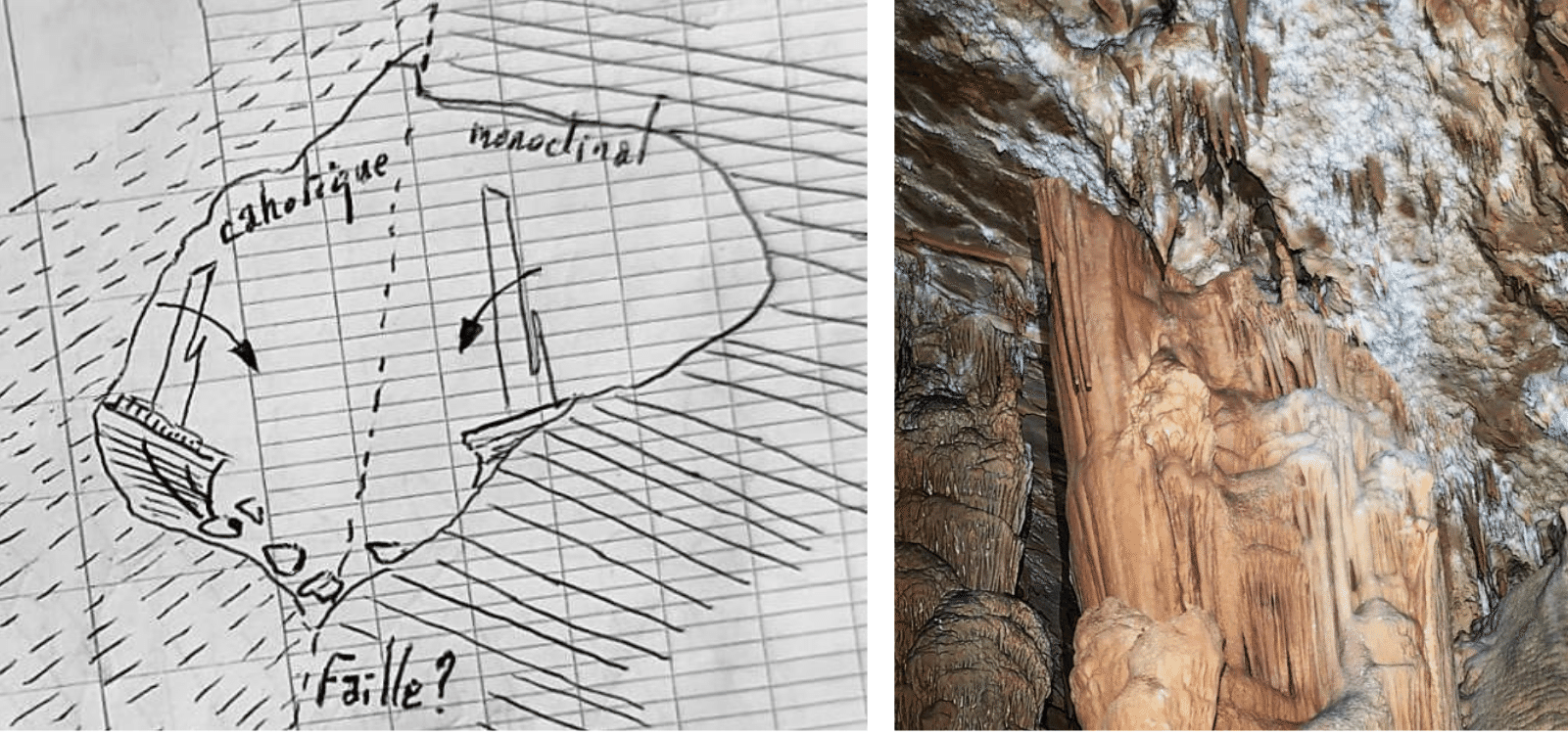 L’observation du plafond par Florian et Vincent tendrait à argumenter en faveur de soubresauts tectoniques. En effet le toit de la « Salle Blanche » semble se diviser en deux zones morphologiques différentes :