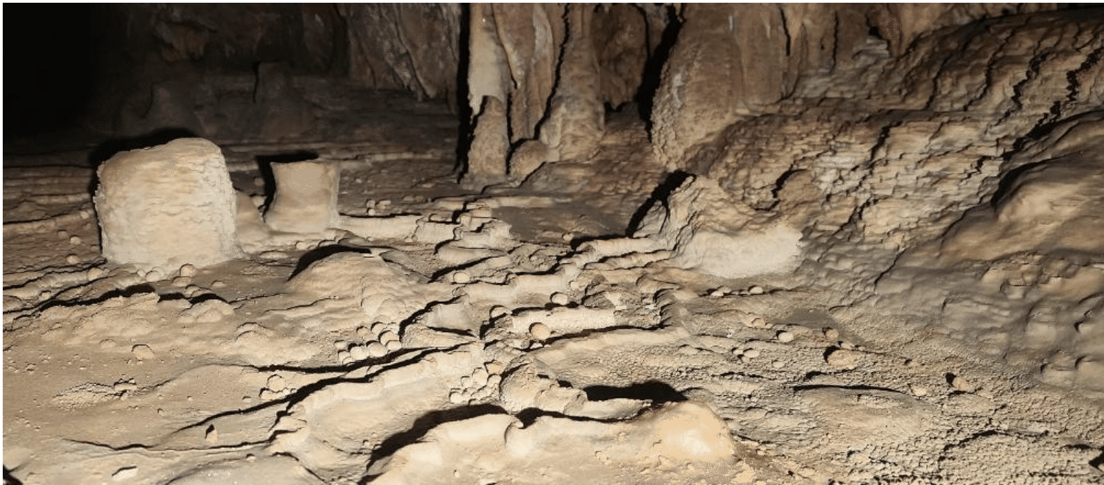 Séismes (tremblements de terre), compaction et glissement des remplissages sédimentaires endokarstiques sous le poids des lourdes concrétions carbonatées, ou effondrement par sous-cavage d’un ancien plancher stalagmitique ? Soubresauts tectoniques, manifestations gravitaires, ou bien érosion et dissolution, à moins qu’il ne s’agisse de la résultante de l’ensemble de ces phénomènes conjugués ? Le débat reste ouvert, mais le résultat est spectaculaire de par les dimensions des colonnes effondrées dont les fragments de plusieurs mètres cubes gisent sur le sol. Ce phénomène date quelque peu puisque des concrétions plus récentes recouvrent d’ores-et-déjà les blocs effondrés.