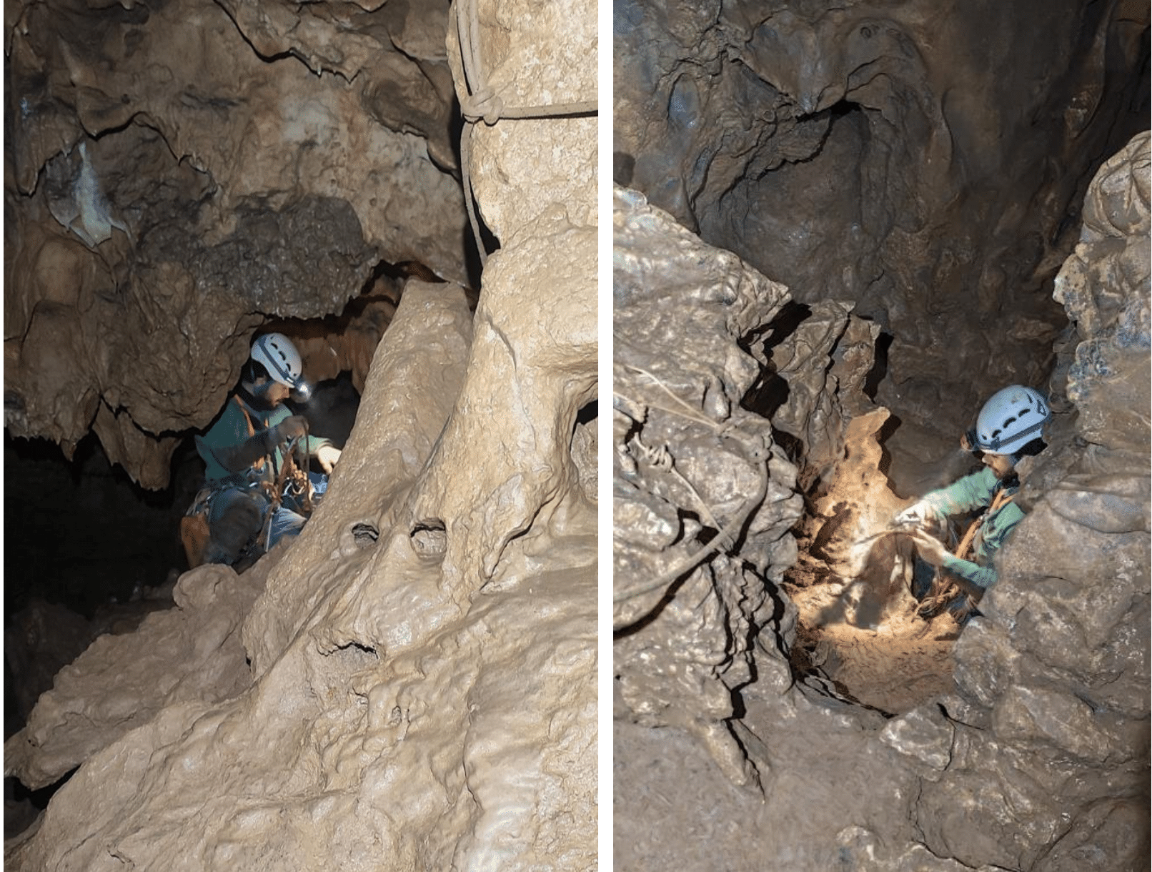 Vincent se porte volontaire pour équiper la descente jusqu’à la « Salle Blanche » avec d’abord un puits de 10 mètres (P10), puis l’installation d’une main courante le long de la grande vire surplombant cette salle. Florian accompagne Vincent dans cet exercice, tandis que David prend le temps d’expliquer le cheminement à suivre après la « Galerie des Lames » et de prodiguer quelques conseils avisés pour l’équipement. Pour Vincent c’est l’occasion d’expérimenter la recherche et l’emploi des amarrages naturels à grand renfort de Dyneemas et de sangles. Florian prendra le relai pour équiper l’accès à la « Galerie des Perles ».